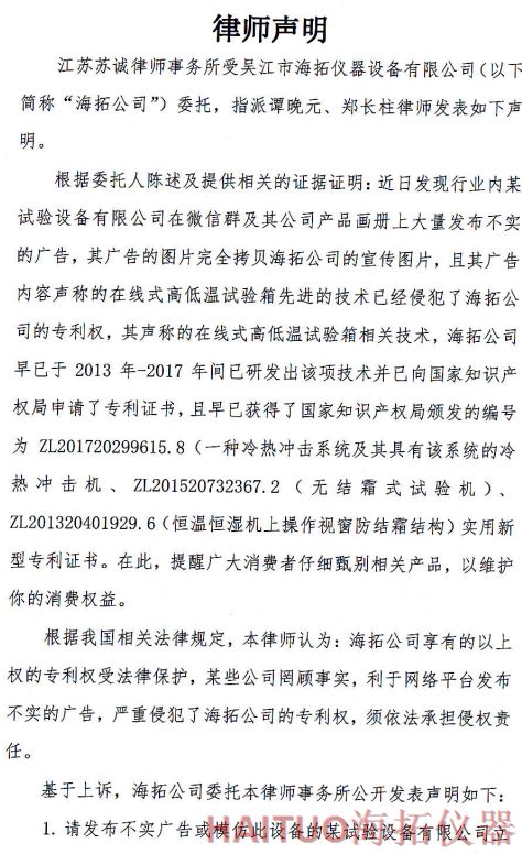 海拓儀器律師聲明:反對(duì)侵權(quán)行為 維護(hù)公司和消費(fèi)者權(quán)益摘要:國(guó)內(nèi)試驗(yàn)設(shè)備領(lǐng)先者吳江市海拓儀器設(shè)備有限公司委托律師事務(wù)所發(fā)布了律師聲明,該聲明指出,當(dāng)前市面上出現(xiàn)了產(chǎn)品專利侵犯海拓儀器權(quán)益,海拓儀器將以法律手段維護(hù)自身利益。該律師聲明要求某試驗(yàn)設(shè)備有限公司立即停止侵權(quán)行為,扯下其在網(wǎng)絡(luò)平臺(tái)的相關(guān)廣告和宣傳畫冊(cè)并同時(shí)停止生產(chǎn)同款設(shè)備。如果該設(shè)備公司不聽勸解,海拓儀器將向人民法院依法起訴該公司侵權(quán)行為,以維護(hù)自身合法權(quán)益和維護(hù)客戶消費(fèi)權(quán)益,并建議廣大消費(fèi)者仔細(xì)甄別相關(guān)產(chǎn)品。? ? ? ?近日,吳江市海拓儀器設(shè)備有限公司委托律師事務(wù)所發(fā)布了律師聲明,該聲明指出,當(dāng)前市面上出現(xiàn)了產(chǎn)品專利侵犯海拓儀器權(quán)益,海拓儀器將以法律手段維護(hù)自身利益。??事件源起于海拓儀器發(fā)現(xiàn)市面上有同類設(shè)備公司通過完全拷貝海拓儀器產(chǎn)品宣傳圖片,在微信群及該公司產(chǎn)品畫冊(cè)上大量發(fā)布不實(shí)廣告。??聲明指出,該廣告聲稱的在線式高低溫試驗(yàn)箱的技術(shù)侵犯了海拓儀器的專利權(quán),該產(chǎn)品專利由海拓儀器 -
