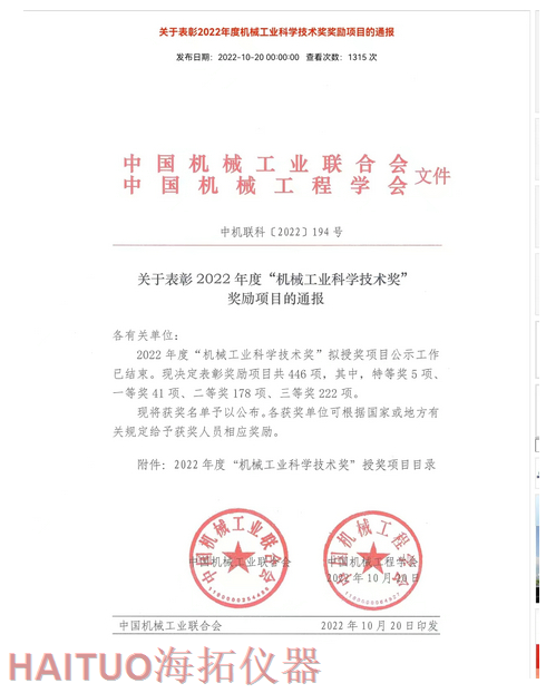 海拓儀器榮獲2022年度中國(guó)機(jī)械工業(yè)科學(xué)技術(shù)獎(jiǎng)?ICC訊?10月20日,2022年度“中國(guó)機(jī)械工業(yè)科學(xué)技術(shù)獎(jiǎng)”項(xiàng)目名錄正式發(fā)布,由海拓儀器(江蘇)有限公司完成的“超快速冷熱沖擊試驗(yàn)系統(tǒng)關(guān)鍵技術(shù)研究與系列應(yīng)用”項(xiàng)目榮獲2022年度“中國(guó)機(jī)械工業(yè)科學(xué)技術(shù)獎(jiǎng)”三等獎(jiǎng)。??據(jù)了解,中國(guó)機(jī)械工業(yè)科學(xué)技術(shù)獎(jiǎng)是根據(jù)《國(guó)家科學(xué)技術(shù)獎(jiǎng)勵(lì)條例》和《社會(huì)力量設(shè)立科學(xué)技術(shù)獎(jiǎng)管理辦法》的有關(guān)規(guī)定,由中國(guó)機(jī)械工業(yè)聯(lián)合會(huì)和中國(guó)機(jī)械工程學(xué)會(huì)共同設(shè)立并經(jīng)國(guó)家科學(xué)技術(shù)部批準(zhǔn),在國(guó)家科技獎(jiǎng)勵(lì)主管部門登記的面向全國(guó)機(jī)械行業(yè)的綜合性科技獎(jiǎng)項(xiàng)。旨在表彰在機(jī)械工業(yè)科技工作中作出突出貢獻(xiàn)的單位和人員,獎(jiǎng)勵(lì)范圍包括:機(jī)械工業(yè)科學(xué)技術(shù)發(fā)明成果、機(jī)械工業(yè)科學(xué)技術(shù)進(jìn)步成果、機(jī)械工業(yè)工程化和新技術(shù)推廣成果和機(jī)械工業(yè)軟科學(xué)和標(biāo)準(zhǔn)成果。??海拓儀器是一家集研發(fā)、制造、貿(mào)易于一體高科技現(xiàn)代化公司,公司成立于2005年,主要產(chǎn)品包括:超快速冷熱沖擊試驗(yàn)機(jī)(熱流儀)、快速溫變應(yīng)力篩選試驗(yàn)箱(ESS), -